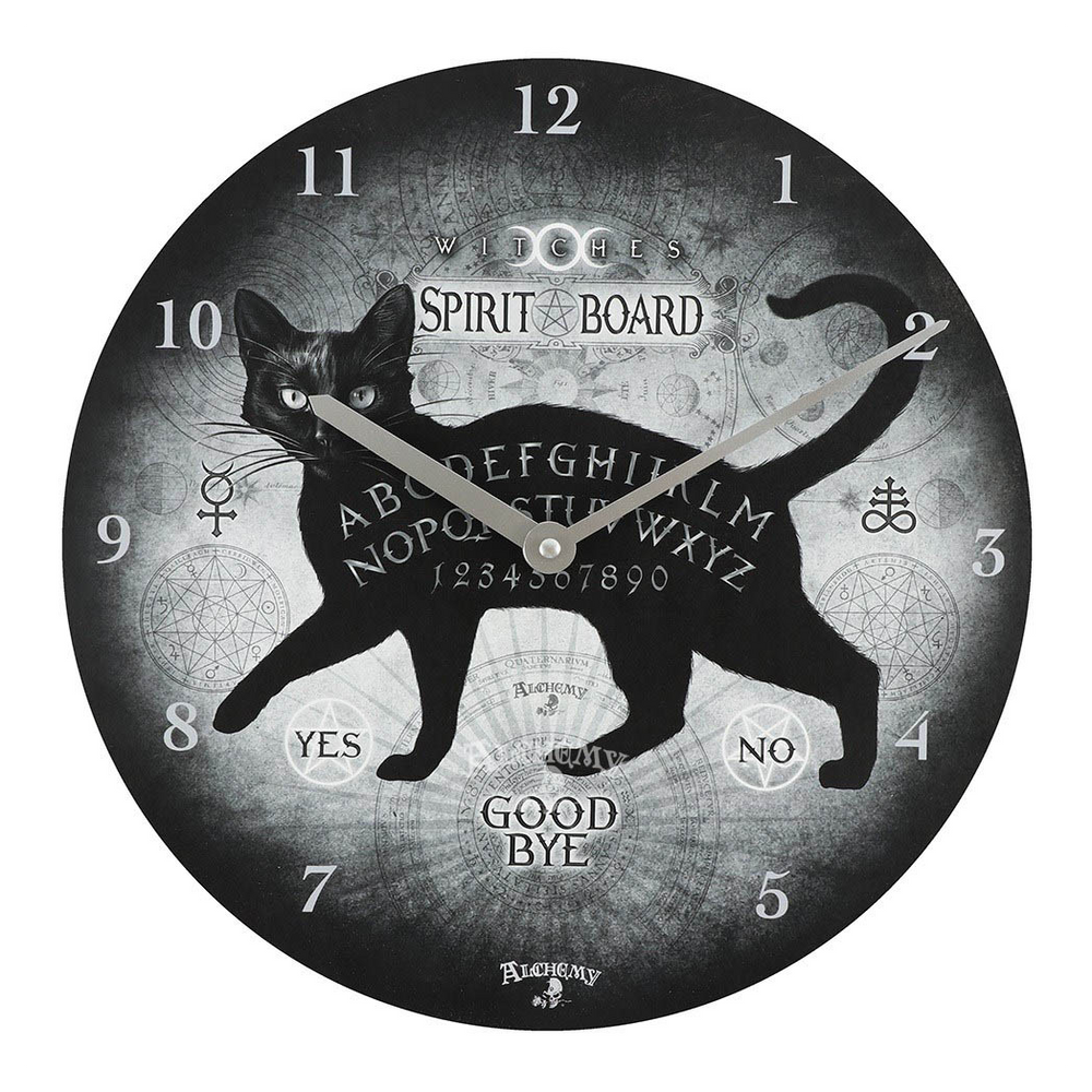Designed by Alchemy London, this 34cm wall clock features a black cat spirit board design, perfect for creating a mysterious and atmospheric decor in the home . Requires 1 x AA battery to operate which is not included.Packaged Dimensions: H35cm x W35cm x D4.5cm"