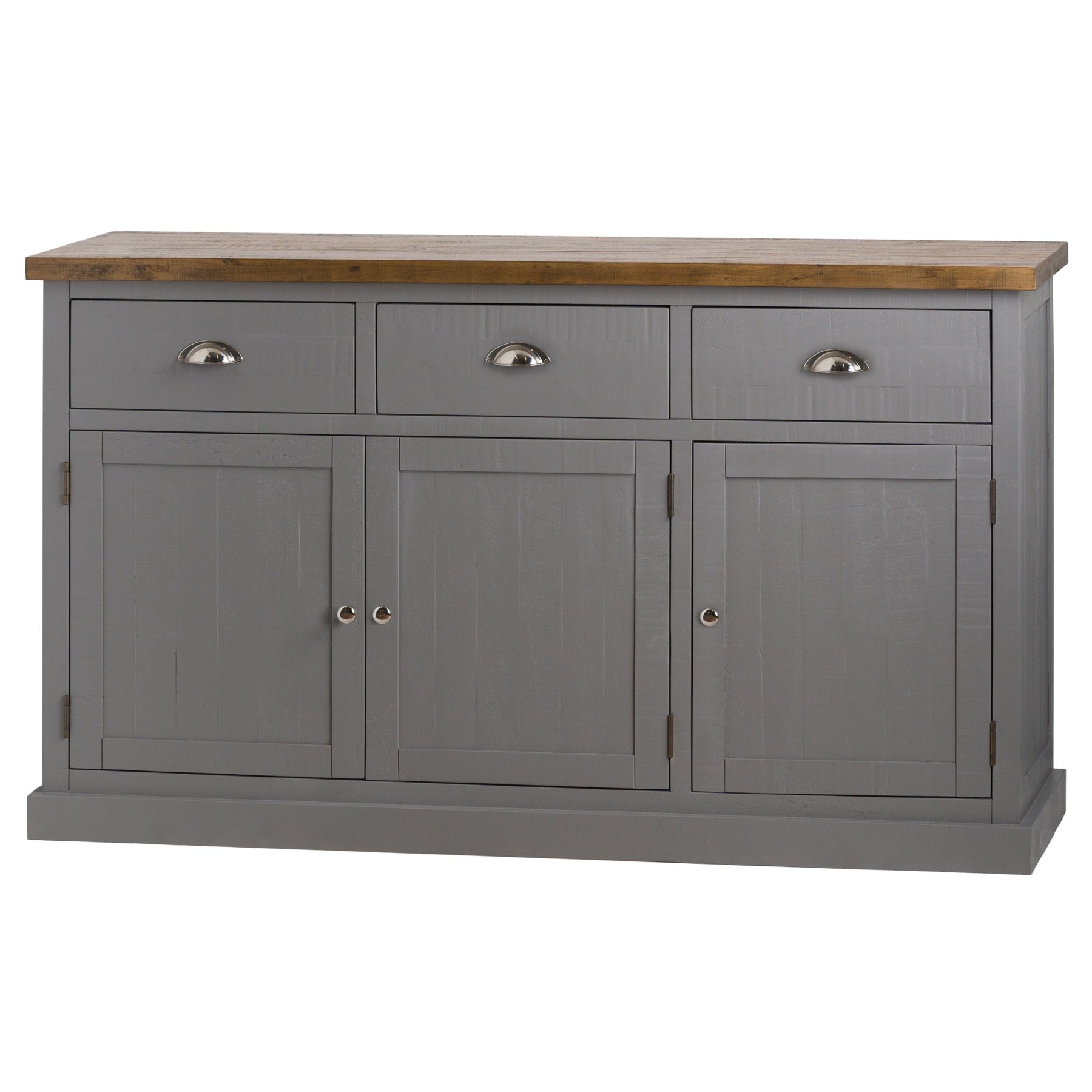 The three drawer three door sideboard brings welcome storage into any interior, with three spacious drawers and three cupboard compartments, this piece can be utilised in various areas of a home, hotel or venue. Featuring a warm grey painted finish and natural pine top, this piece gives a rustic and handmade look which adds to the authenticity of this range.